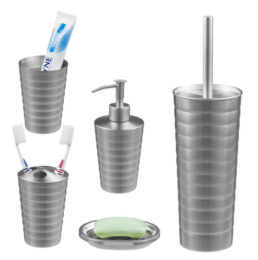 Nowoczesny zestaw srebrnych akcesoriów łazienkowych – 5 elementów | Stal nierdzewna, matowe wykończenie