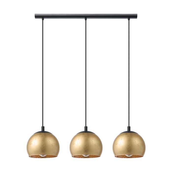 Lampa wisząca ALBARACCIN z trzema szklanymi, kulistymi złotymi kloszami o średnicy 19 cm. Klosze zostały zwieszone na czarnych, tekstylnych przewodach, z czarnej, podłużnej podsufitki. Elegancka lampa wisząca charakteryzuje się prostym i pięknym designem. Lampa oferuje stylowe oświetlenie w salonie, kuchni lub jadalni nad stołem jadalnianym. Żarówki nie wchodzą w zakres dostawy. Lampa pasuje do każdej żarówki z trzonkiem E27.