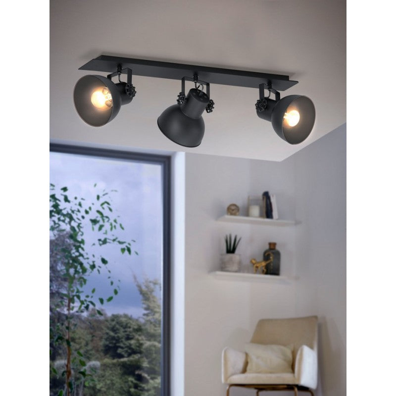 Kinkiet, lampa ścienno-sufitowa, plafon BARNSTAPLE 1 wykonany jest z czarnego metalu z trzema ruchomymi, czarnymi głowicami. Lampa w monochromatycznym designie idealnie pasuje do nowoczesnych mebli w stylu industrialnym. Obrotowe głowice lampy pozwala na ustawienie indywidualnych akcentów świetlnych w pomieszczeniu - czy to w salonie, sypialni, przedpokoju czy jadalni. Żarówki nie wchodzą w zakres dostawy. Oprawa przystosowana do każdego źródła światła z trzonkiem E27.