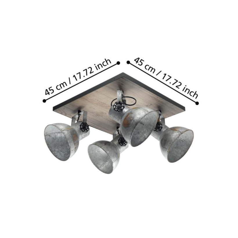 Plafon, lampa sufitowa, reflektorowa BARNSTAPLE posiada kwadratową, metalową podsufitkę, z dekoracją z brązowego drewna. Cztery ruchome metalowe głowice w ocynkowanym, używanym wyglądzie oraz czarne śruby blokujące nadają lampie wyjątkowo rustykalny wygląd. Ten reflektorek sufitowy doskonale wpisuje się w industrialny trend. Obrotowe głowice lampy pozwalają na ustawienie indywidualnych akcentów świetlnych w pomieszczeniu, czy to w kuchni, salonie, sypialni czy przedpokoju. Żarówki nie wchodzą w zakres dostawy. Oprawa przystosowana do każdego źródła światła z trzonkiem E27.
