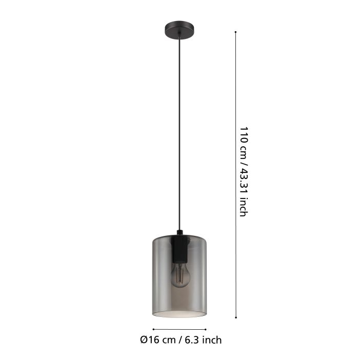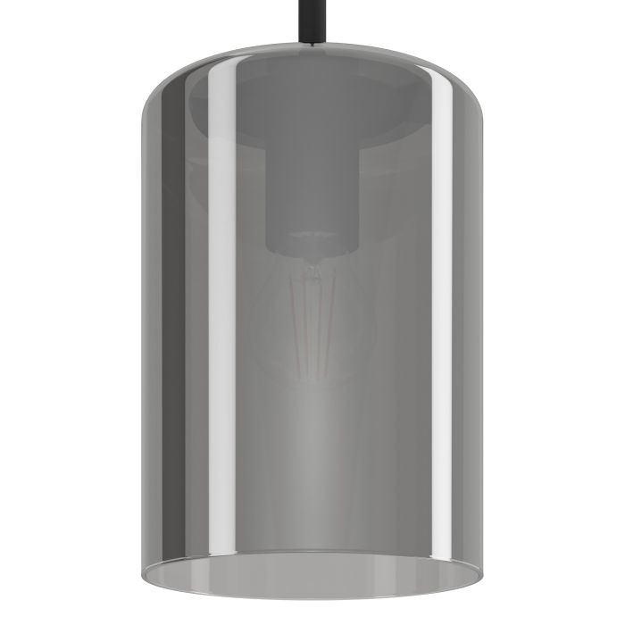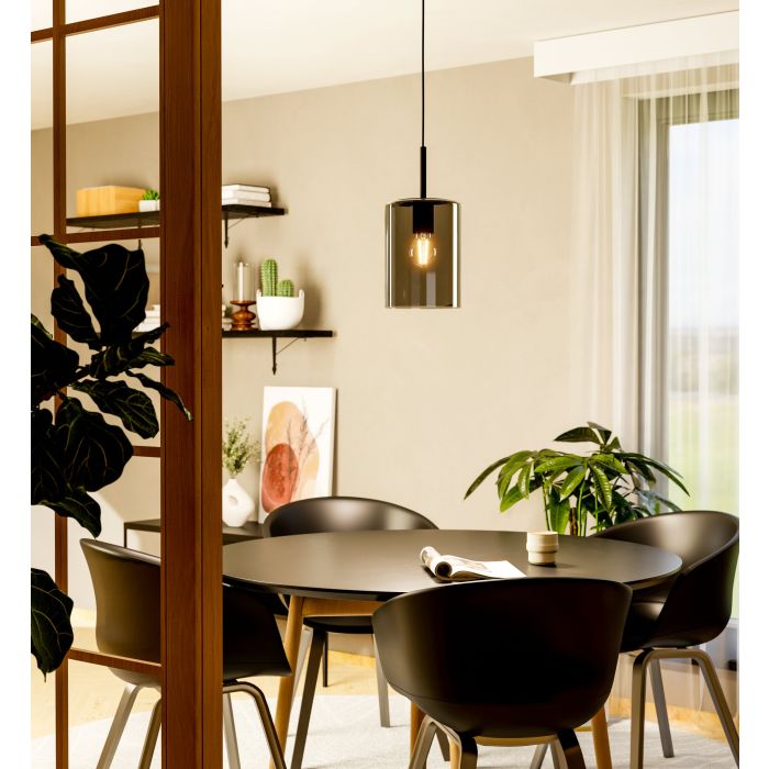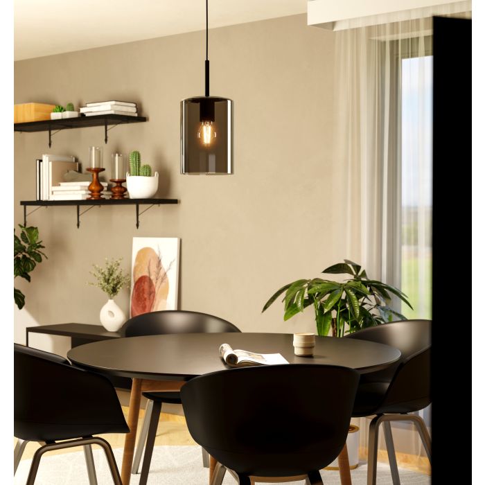 Lampa wisząca CADAQUES 1 składa się z cylindrycznego, szklanego klosza w kolorze czarnym przezroczystym (fumé) i czarnej metalowej podsufitki. Lampa wisząca idealnie pasuje do nowoczesnych i skandynawskich wnętrz i oferuje stylowe oświetlenie do każdego pomieszczenia - czy to w salonie, czy w jadalni nad stołem jadalnym. Żarówka nie wchodzi w zakres dostawy. Lampa pasuje do każdej żarówki z trzonkiem E27.