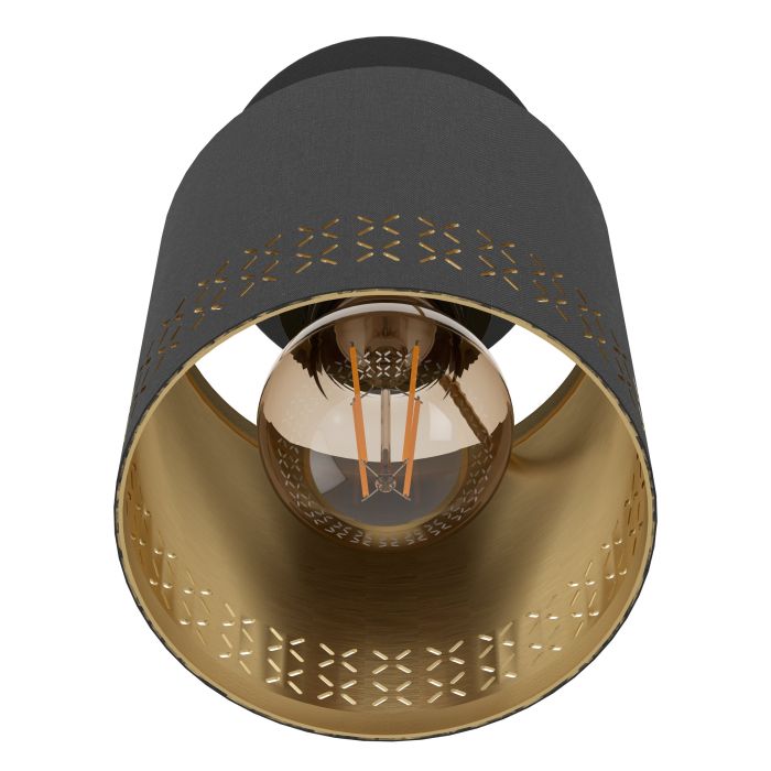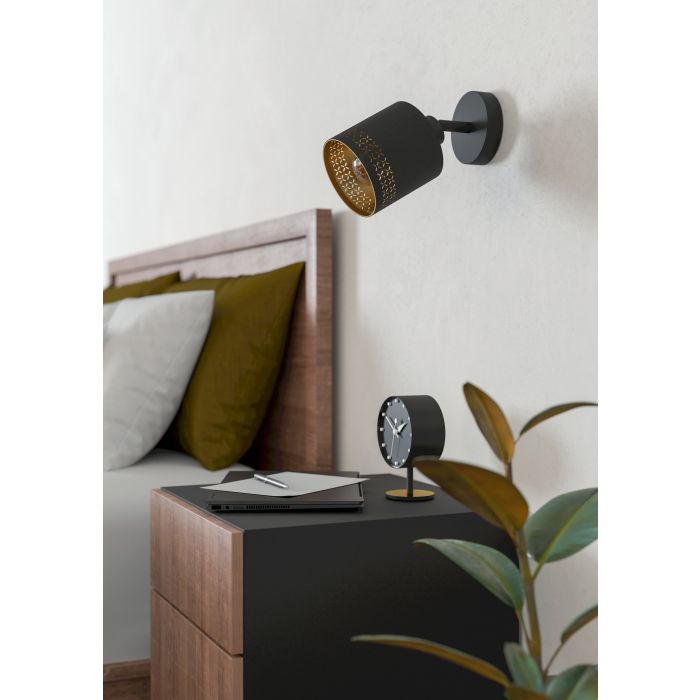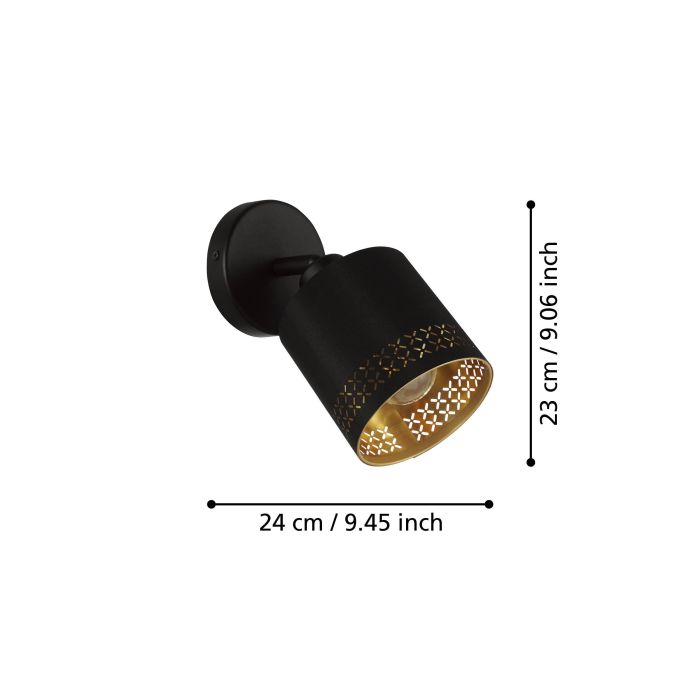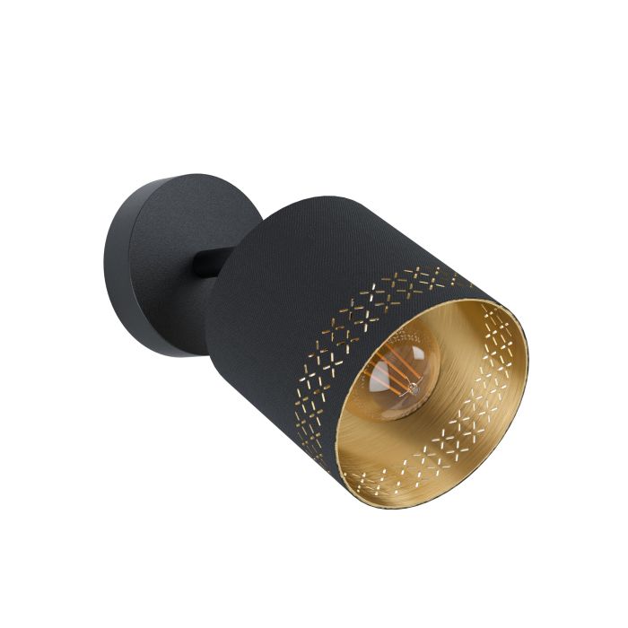 Lampa ścienna i sufitowa ESTEPERRA z czarno-złotym abażurem. Małe wycięcia znajdujące się na krawędzi klosza tworzą fascynującą grę światła i cienia zaraz po włączeniu lampy. Oprawa ścienna wtapia się w niemal każdy styl życia i może być również używana jako lampa sufitowa. Obrotowa głowica lampy daje możliwość ustawienia indywidualnych akcentów świetlnych w pomieszczeniu – czy to w salonie, sypialni, przedpokoju czy jadalni. Źródło światła to jedna żarówka z trzonkiem E27 - przedstawiona żarówka nie jest objęta zakresem dostawy.