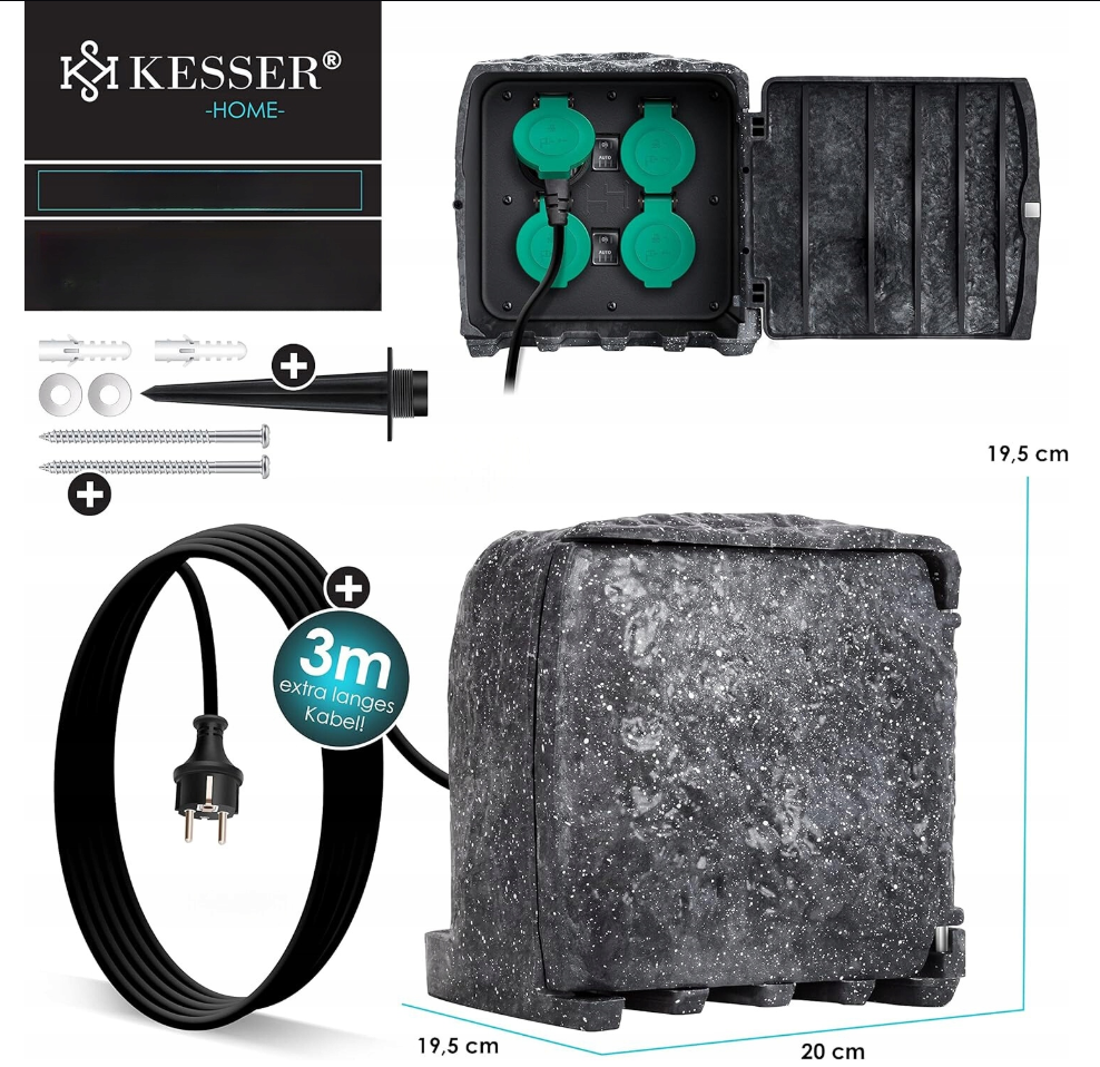 KESSER Gniazdo ogrodowe z obudową odporną na UV i warunki atmosferyczne oraz słupkiem do wbicia w ziemię, idealne do użytku na zewnątrz, z dwoma trybami ustawień, czujnikiem zmierzchowym, 4 gniazdami ochronnymi z automatycznie zamykającymi się pokrywami, elastyczna instalacja dzięki 3-metrowemu kablowi.