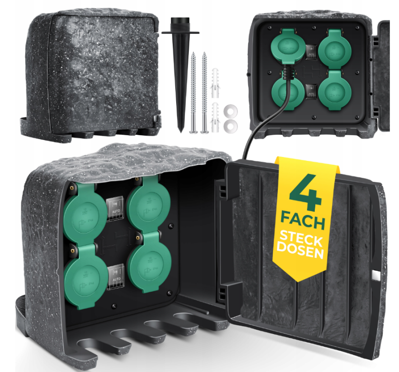 Elektrownia wewnętrzna jest chroniona przez obudowę, która jest wodoodporna zgodnie z klasą ochrony IP44. Dodatkowo skrzynka elektryczna jest zabezpieczona automatycznie zamykającą się pokrywą dla czterech gniazd, co zapobiega otwieraniu pod wpływem warunków atmosferycznych i zapewnia pełne bezpieczeństwo czterem gniazdom ochronnym oraz Twoim urządzeniom elektrycznym. Dzięki czterem automatycznie zamykającym się pokrywom zapobiega się także łatwemu dostępowi dzieci do gniazd.