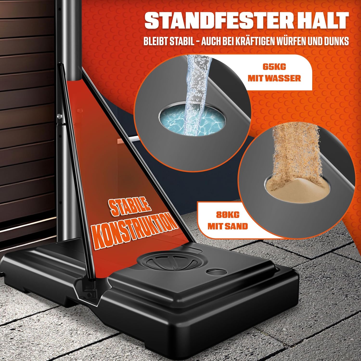 STABILNA I WYPEŁNIANA PODSTAWA: Dzięki wypełnianej podstawie obręcz do koszykówki jest szczególnie wysokiej jakości i stabilna, dzięki czemu wytrzymuje nawet bardzo mocne rzuty. Możesz po prostu napełnić podstawę wodą, ale zimą możesz także wypełnić podstawę piaskiem. Dwa zintegrowane koła zapewniają znacznie większą elastyczność niż kosze do koszykówki, które muszą być trwale zamontowane na ścianie.