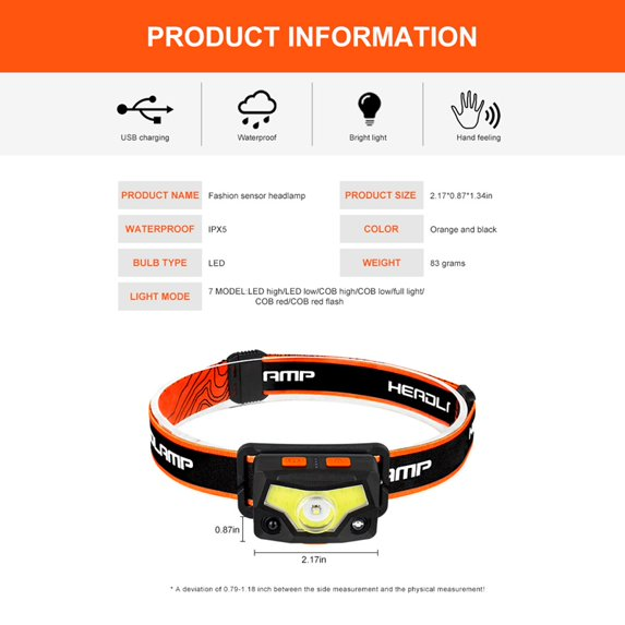Latarka czołowa akumulatorowa z czujnikiem ruchu XPG + COB – 7 trybów, USB