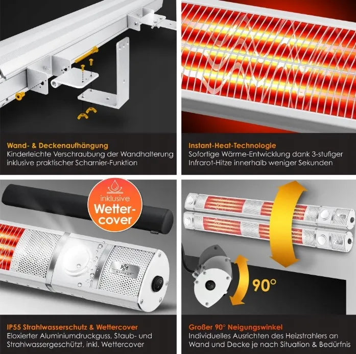 ➡ STEROWANIE ŚCIENNE I MOC: Ten wydajny promiennik podczerwieni z uchwytem ściennym ma 3 pozycje przełączania (1000 W, 2000 W, 3000 W). Jest to urządzenie do montażu na ścianie. Szybkie, natychmiastowe i wydajne ogrzewanie bez wstępnego podgrzewania dzięki ciepłu podczerwonemu - idealne w branży gastronomicznej, na basenach, na kempingu lub w warsztacie - grzejnik z łatwością zasila do 25m²