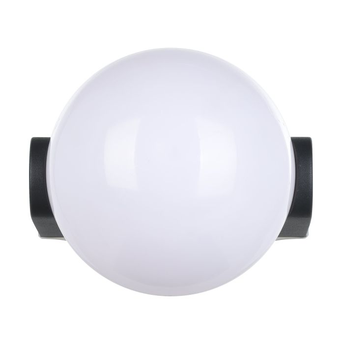 Lampa ścienna zewnętrzna, kinkiet ogrodowy serii RUBIO. Podstawa wykonana z aluminium, w kolorze czarnym. Lampa posiada biały klosz w kształcie kulki wykonany z tworzywa. Wysokość 15 cm, szerokość 17 cm, głębokość 19 cm. Źródło światła to jedna żarówka, na duży gwint E27, o mocy maksymalnej 15W. Żarówka nie jest dołączona do zestawu. Klasa szczelności: IP44.