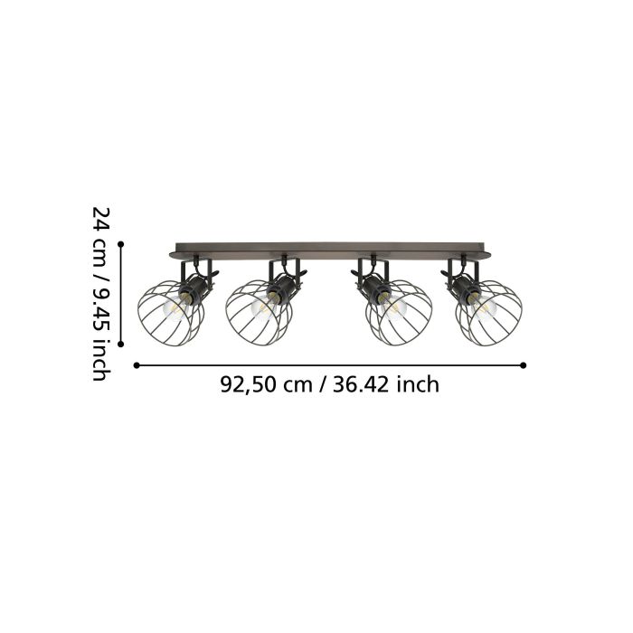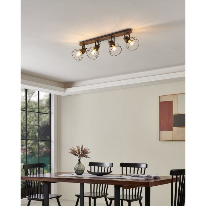 Lampa sufitowa z serii SAMBATELLO z czterema szarymi, ruchomymi, drucianymi reflektorami. Spot został połączony z dekoracyjnym panelem w kolorze brązowego drewna. Klosze tworzą fascynującą grę światła i cienia. Oprawa uzupełnia wyposażenie w stylu industrialnym, a dzięki obrotowej głowicy lampy zapewnia ukierunkowane oświetlenie w pomieszczeniu - czy to w kuchni, salonie, sypialni czy przedpokoju. Przedstawione żarówki nie są objęte zakresem dostawy. Lampa pasuje do każdej żarówki z trzonkiem E27.