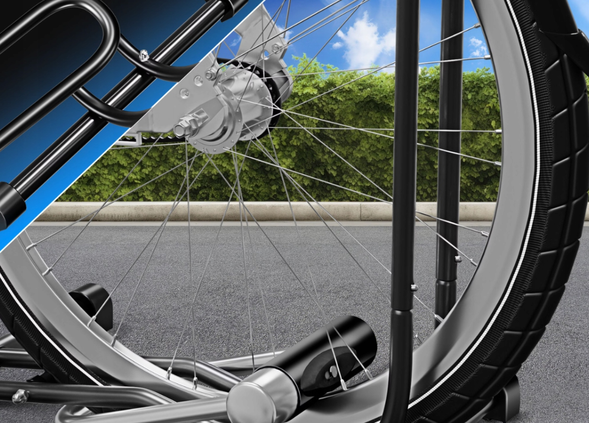 Uniwersalna konstrukcja pozwala na parkowanie rowerów miejskich, górskich oraz elektrycznych. Stojak pasuje do kół o rozmiarze od 16 do 27,5 cala oraz opon o szerokości do 65 mm. Możliwość ustawienia roweru na przednim lub tylnym kole zapewnia pełną elastyczność użytkowania.
