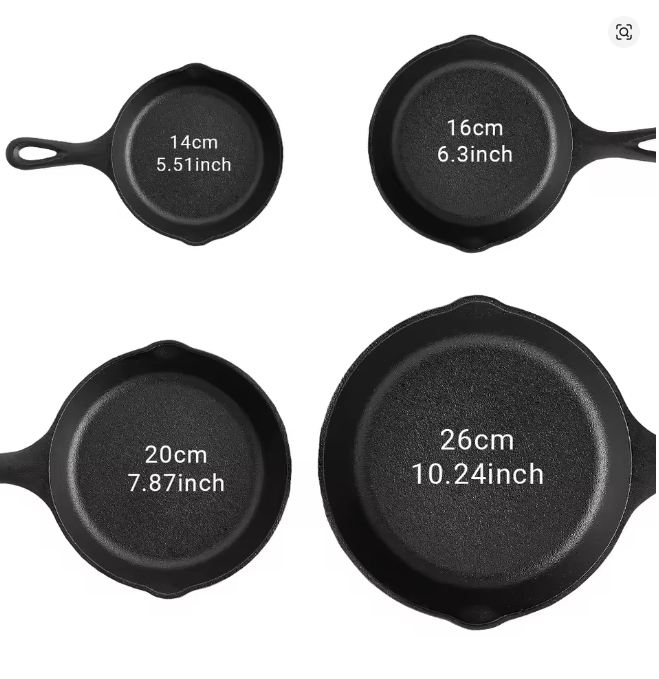 Profesjonalny zestaw żeliwnych patelni w rozmiarach 14, 16, 20 i 26 cm, wstępnie przyprawionych i gotowych do użycia. Bez powłoki, bezpieczne dla zdrowia, odporne na rdzę i zapewniające równomierne rozprowadzanie ciepła. Idealne do smażenia, duszenia i przyrządzania potraw jak w restauracji – trwałe i uniwersalne.